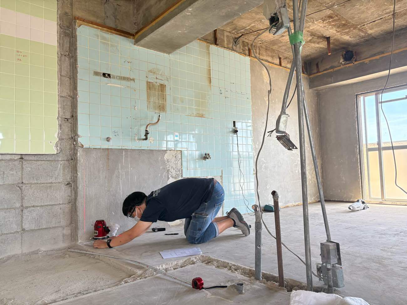 先ずはレーザーという機械を使い、水平垂直な真っ直ぐな基準な線を描きだします。