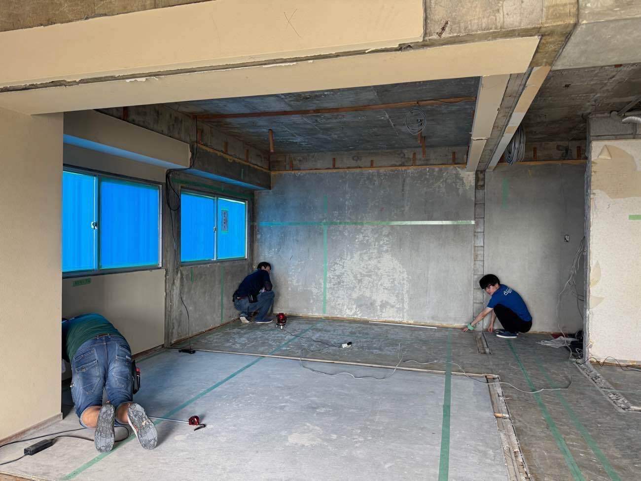 『墨出し』とはプランナーが描きだした図面の寸法を、実寸サイズで現場に書き写す作業の事を言います。