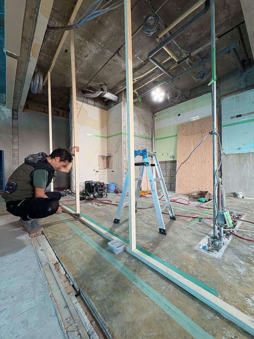 その後は、基準線に沿って間仕切りとなる間柱を建てていきます。