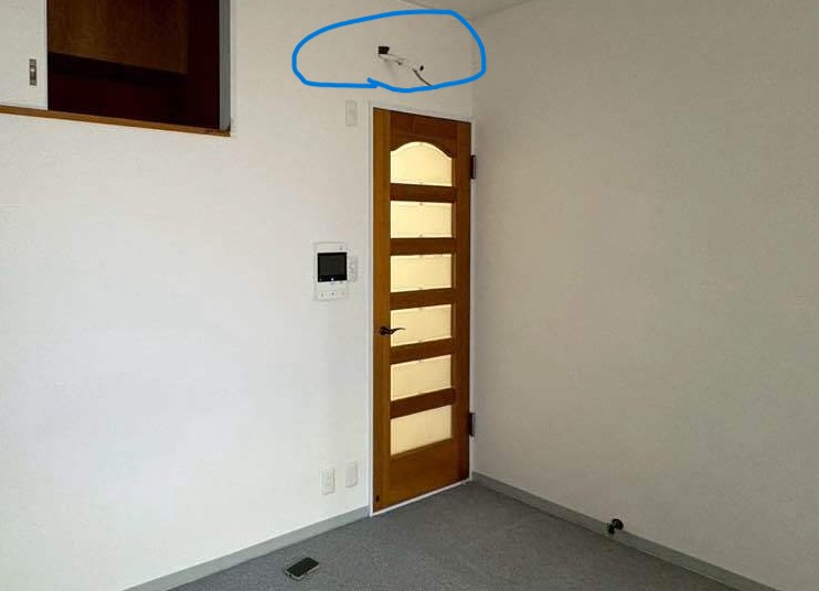 リビング側からの写真ですが、インターホンの裏側が先程の廊下物入なので、上の方に壁から出ているエアコン用冷媒配管があることから、