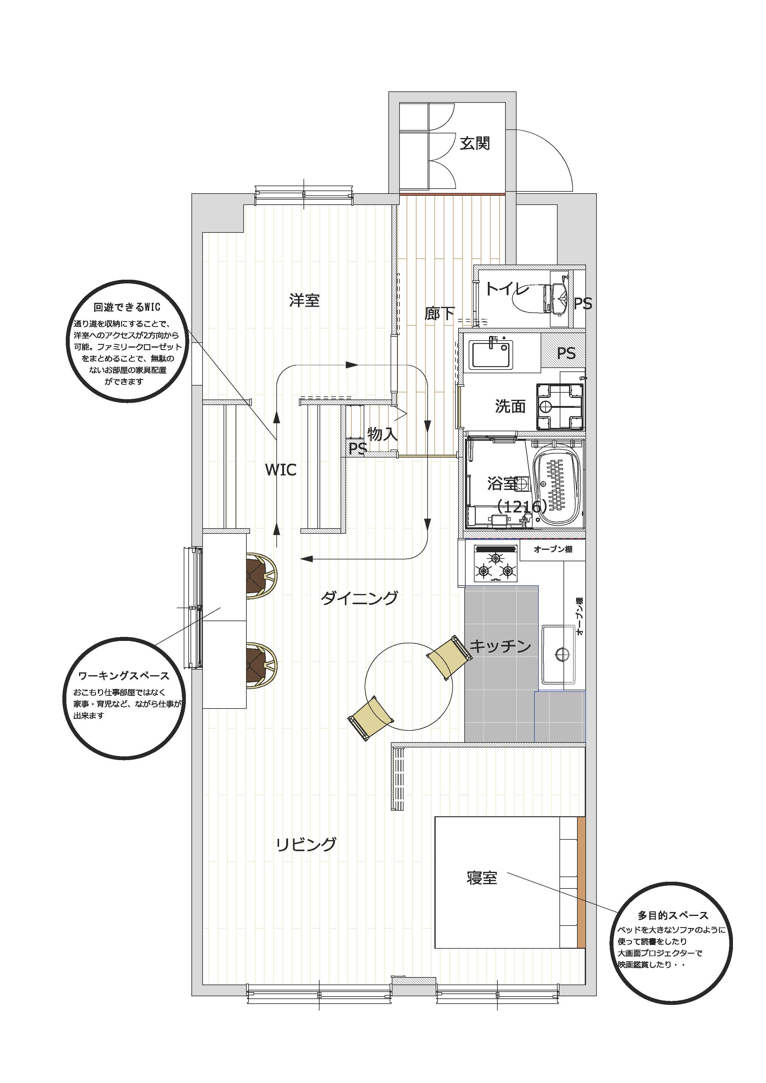 通り道を収納にすることで、 洋室へのアクセスが2方向から可能。ファミリークローゼットをまとめることで、無駄のないお部屋の家具配置ができます。